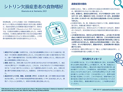 この調査研究は、シトリン欠損症患者の食嗜好を理解し、食品選択の重要な基準を明らかにするために実施されました。患者さんとそのご家族を対照として、435品目の食品に対する嗜好を1〜4の尺度で尋ねました。調査の結果、患者さんは対照者よりも多くの食品を嫌がりました。嫌いな食品は、炭水化物が多く、脂質が少なく、タンパク質が少ないものだとわかりました。また、エネルギーを産生する栄養素の中で炭水化物が患者さんの食の嗜好に最も強い影響を及ぼしており、男性患者に比べ女性患者は高炭水化物食品を嫌う傾向が強いことも明らかになりました。
